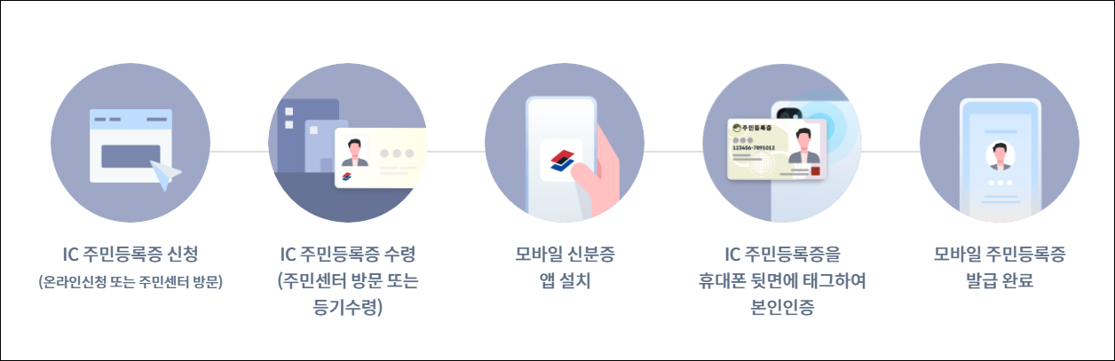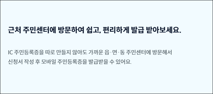 - 주민등록증의 경우: 가까운 주민센터에서 IC칩이 탑재된 주민등록증을 발급받은 후, 모바일 신분증 앱을 설치하고 스마트폰에 태그하면 바로 모바일 신분증이 생성됩니다.