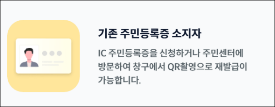 QR코드 기반 방식은 IC칩 신분증이 없는 이용자도 발급이 가능하도록 설계된 방식입니다. 다만, 이 방식은 초기 1회에 한해 주민센터 방문이 필요하며, 본인 확인 후 일회용 QR코드를 제공받아 앱에서 스캔하는 절차를 거칩니다.
