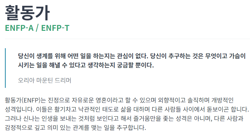 - 영어로 제공되는 사이트이지만, 각 성격 유형에 대한 자세한 설명과 함께 관련 직업 정보도 제공합니다.